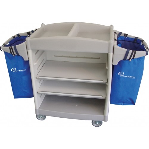 Carrinho Hoteleiro e Hospitalar Arrumadeira, fabricado em Polipropileno de alta resistência com colunas em alumínio anodizado. Com rodas pneumáticas que auxiliam no transporte de utensílios de limpeza em pisos irregulares. Ideal para pousadas onde o transporte é feito por gramados, campos, ou onde necessita apenas de transporte em locais que não possam ter barulhos.