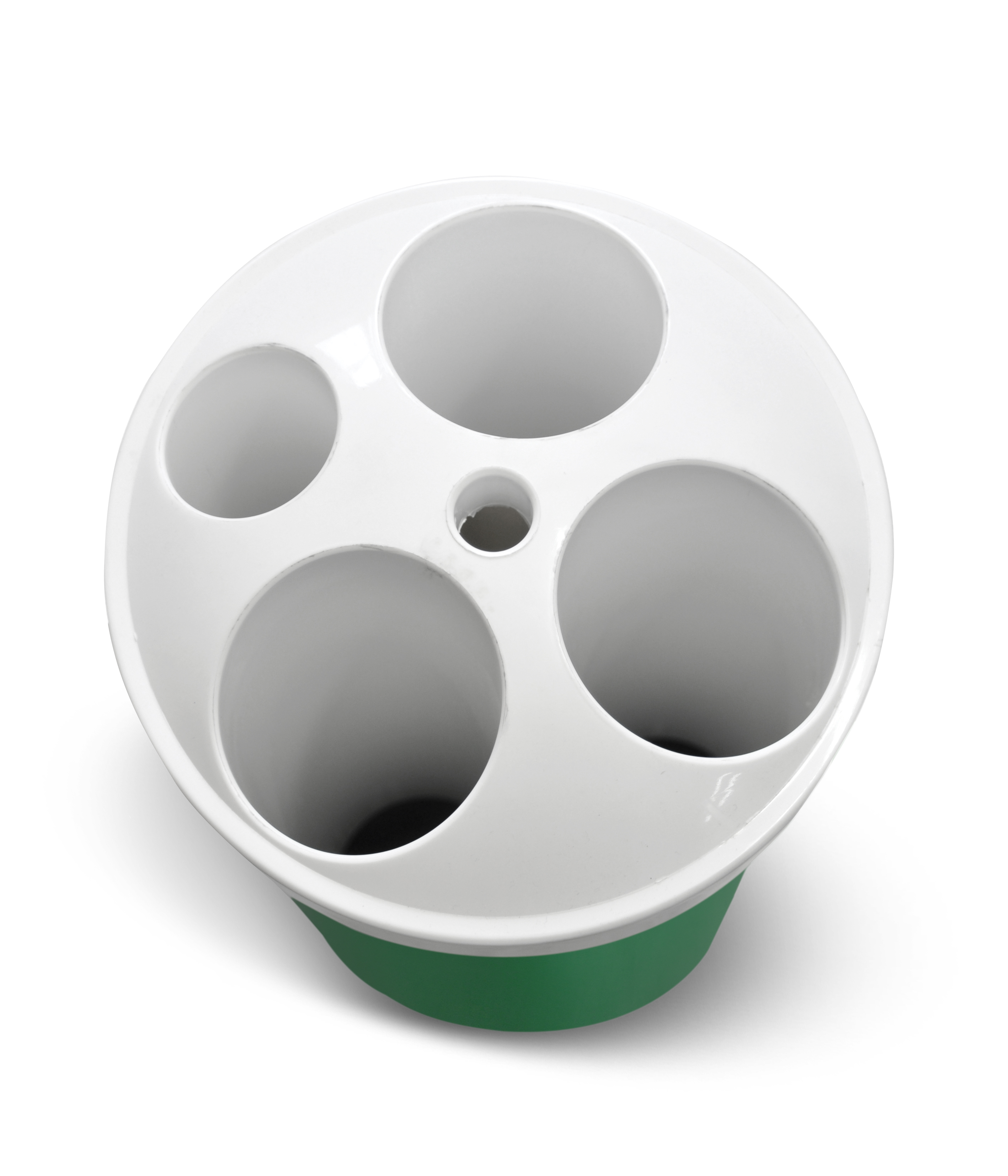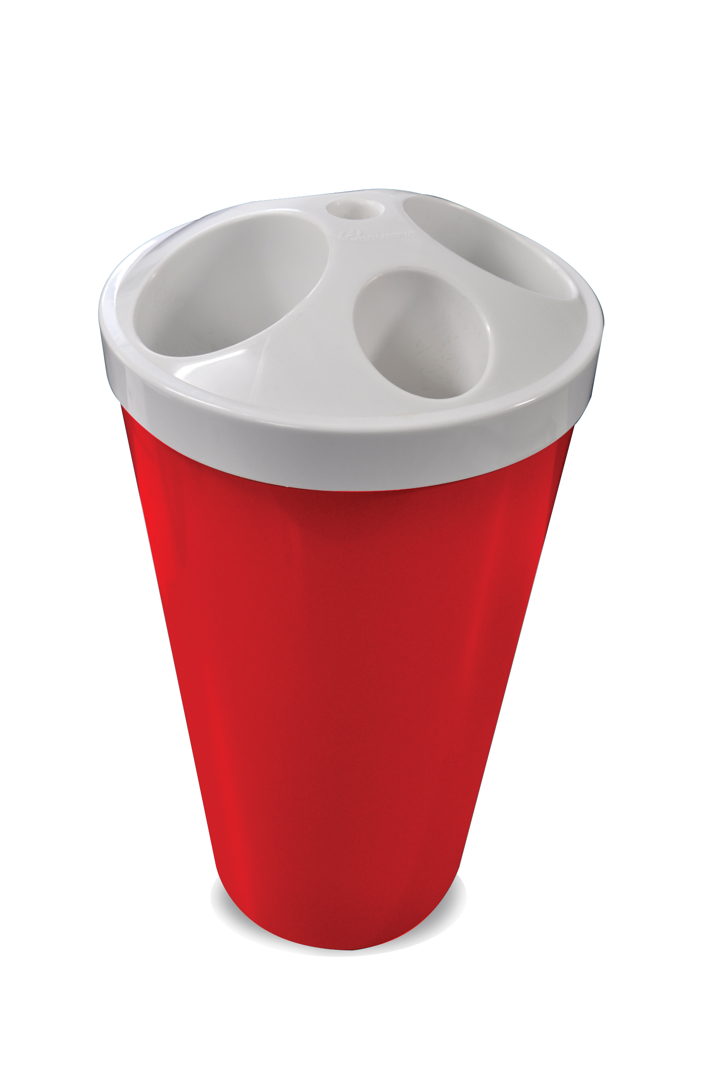 O Cesto Dispensador de copos é um conjunto formado por 1 cesto de 23 litros, disponível em até 10 cores e um dispensador de copos, somente na cor branca, o qual apresenta 5 cavidades: