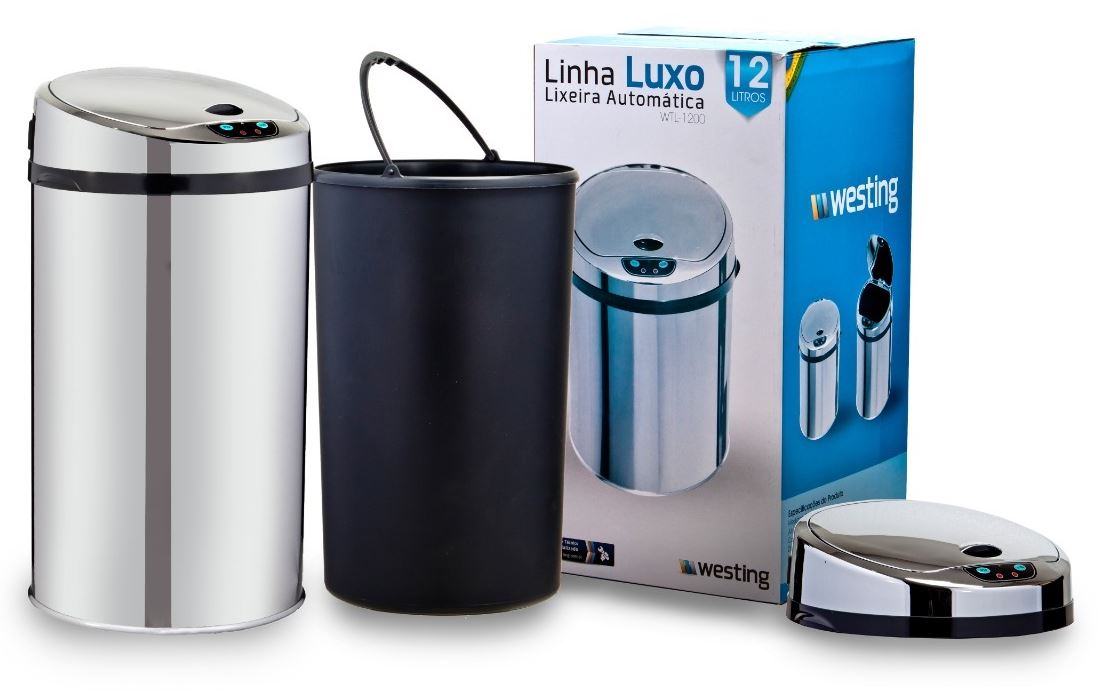 Compartimento interno para saco de lixo em plástico. Removível e Lavável. opera com 4 Pilhas, que tem duração estimada de 3 a 6 meses para uso doméstico normal.