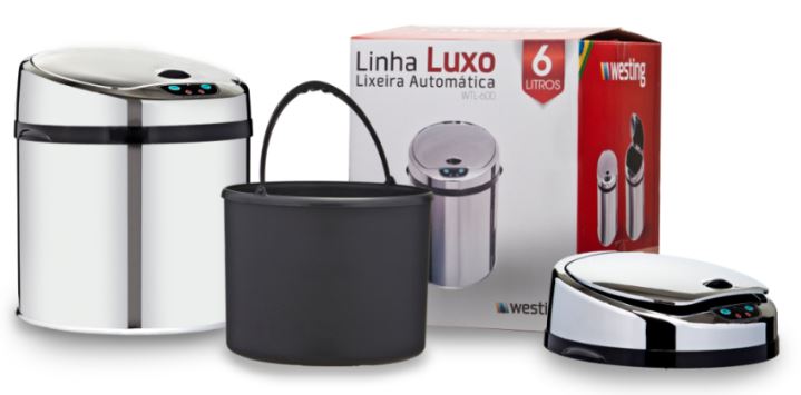 Compartimento interno para saco de lixo em plástico. Removível e Lavável. opera com 4 Pilhas, que tem duração estimada de 3 a 6 meses para uso doméstico normal.